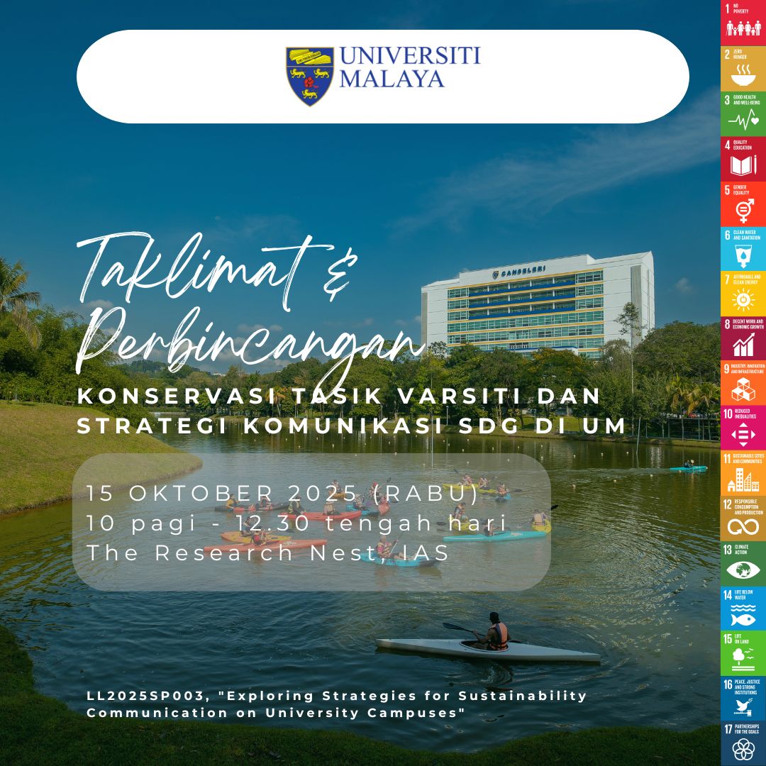 On 15 October 2025, UM Sustainable Development Centre hosted a session titled Tasik Varsiti Conservation Briefing, Feedback, and Communication Strategies, aimed at promoting best practices in lake conservation, providing updates on Tasik Varsiti’s water quality, and enhancing community engagement in sustainable lake management.
